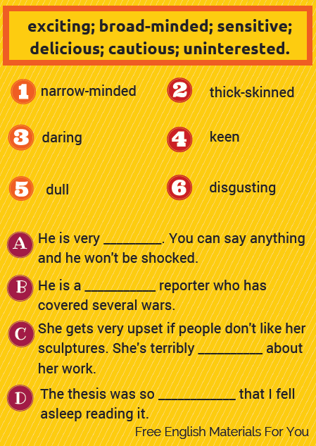 Match the adjectives in the box with their opposites. Then complete the sentences A) =>D) with one of the adjectives of the first part of the test.