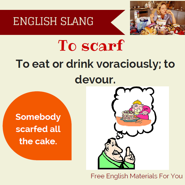 Never heard of it actually. In my country we would say ‘scoff’, scoff down the cake…. Even though I know scoff means something else.
