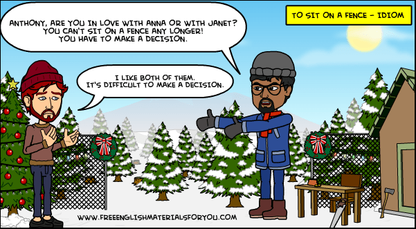 As you can see in the last example sentence, a variation of this idiom is “to be on a/the fence“, with the same meaning.